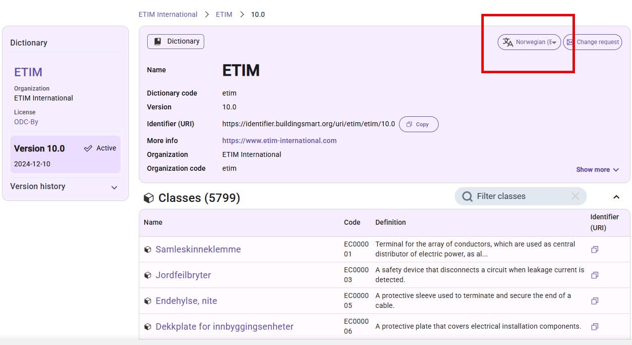 ETIM translations contain validated translations which are maintained by native speaking individuals from the industry and trade associations that support our cause. These translations are managed and owned by our local ETIM chapters. German and Norwegian are two languages that have been checked and validated for ETIM 10.0 by the national ETIM Chapters in Germany and Norway. Both translations are openly available to the public, courtesy of ETIM Germany and ETIM Norway, and therefore could be uploaded without any restrictions.