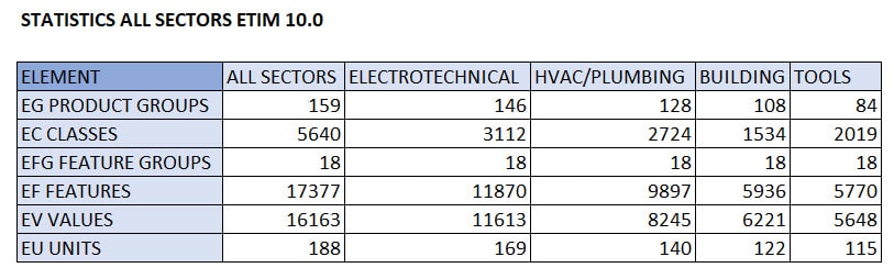 The new ETIM 10.0 release is the result of in total 5264 requests for change (RFC). Also 119 new classes have been added. ETIM 10.0 includes the completely new feature groups, as announced earlier, to enable grouping (categorizing) of features in sections in groups like material, electrical or dimensions. Also the class grouping has been substantially reworked and improved, needed due to the merger of sectors in the past and to properly assign new products to the right groups.