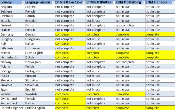 At this moment it is fully available in English, German and Dutch, for some sectors also in other languages. See for the current availability the table below. Other languages and/or sectors will be updated to the current release by the national ETIM organizations and implemented into the ETIM database as soon as available.